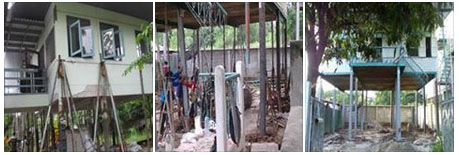 3. ขุดดินที่รอบคานปูนที่รับน้ำหนักฝาผนังด้านในใต้ถุนบ้านแล้วตั้งรอกโซ่รับน้ำหนักที่เสาบ้าน